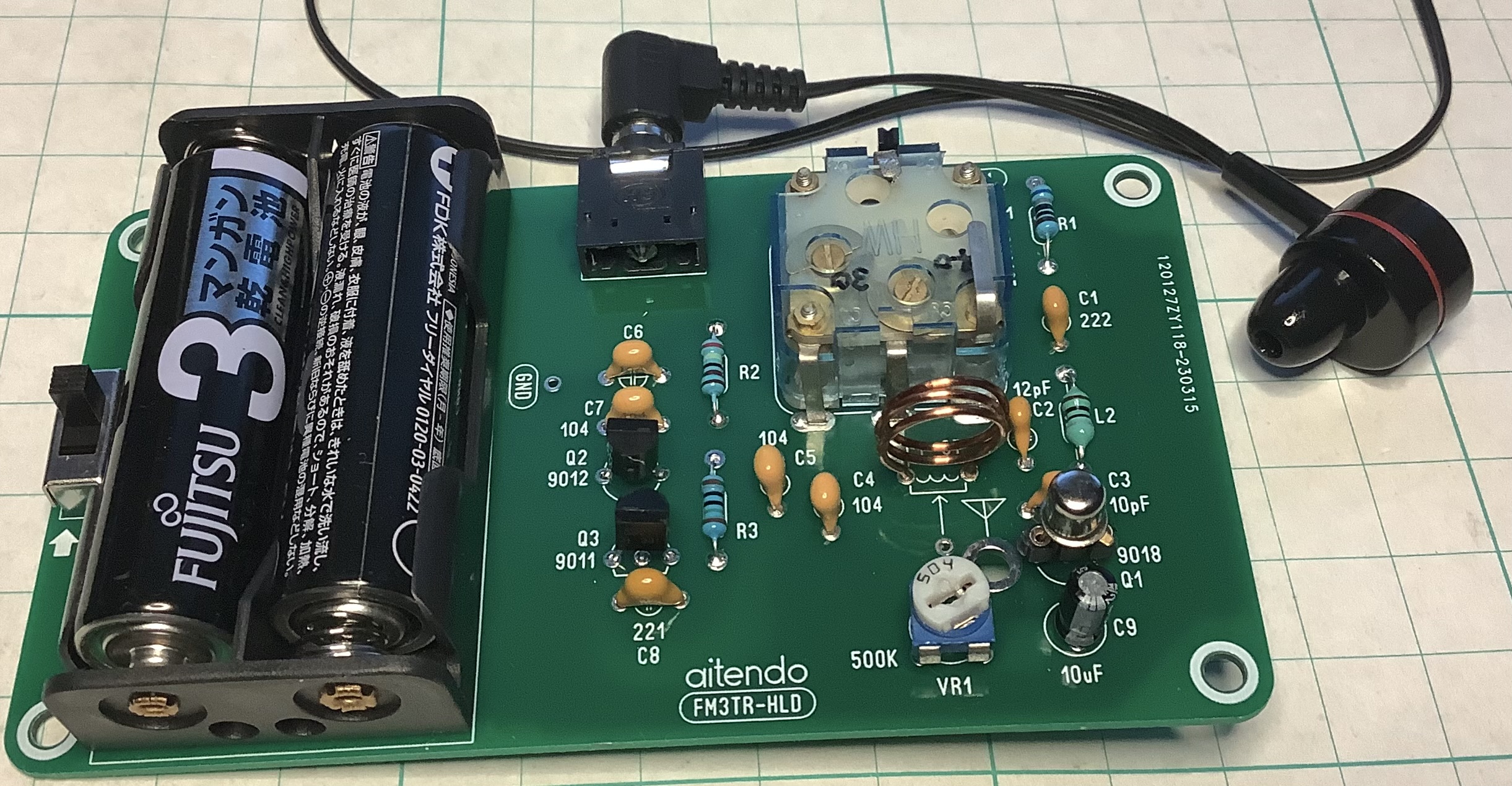 aitendoさんの2バンドFMラジオキットK-FM3TR-HLDを購入したので作ってみた。回路図から超再生検波に簡単なアンプで構成されているラジオだと判る。