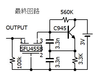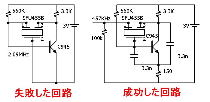 成功した回路では無調整回路とは思えないくらい綺麗な出力を得ることが出来た。しかし出力インピーダンスは高く100K→10Kでは発振が止まってしまう。周波数をピッタリ455KHzに追い込めるかは追試が必要だが、455KHzが欲しいなら別のデバイスを使った方が良さそう。