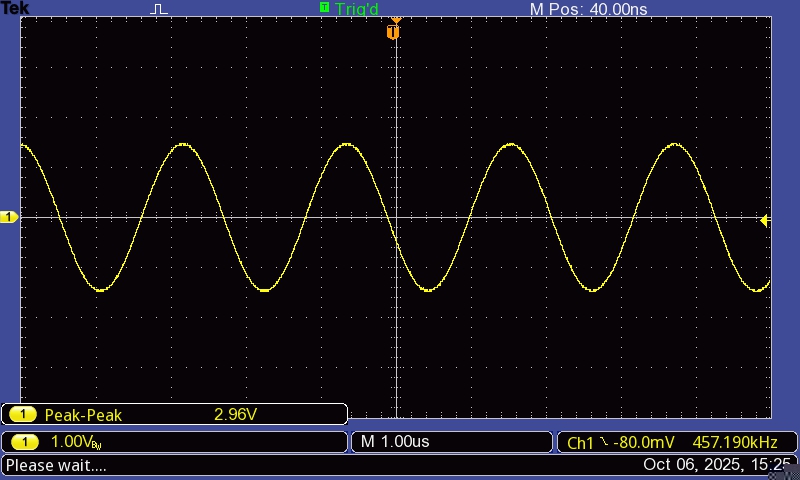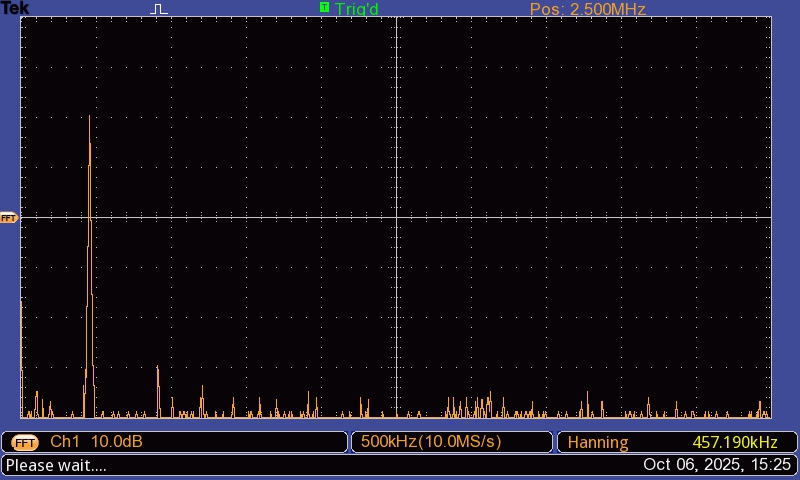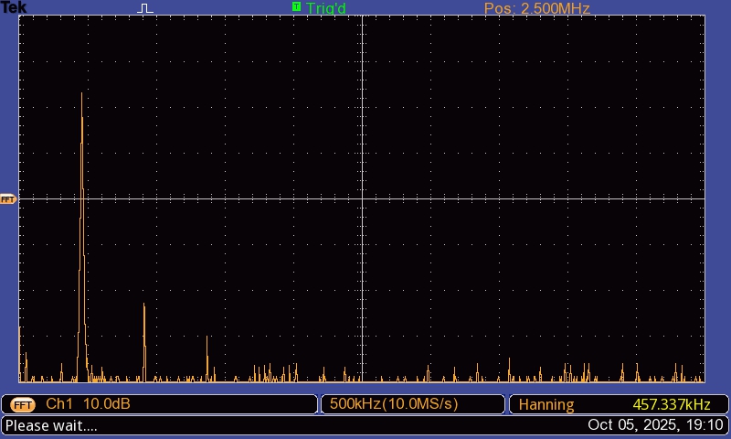 最終的にはよくある変形コルピッツ回路へ変更。その結果高調波が殆ど見えない程度まで綺麗な出力となった。これで周波数が455KHzピッタリなら文句無いのだが。