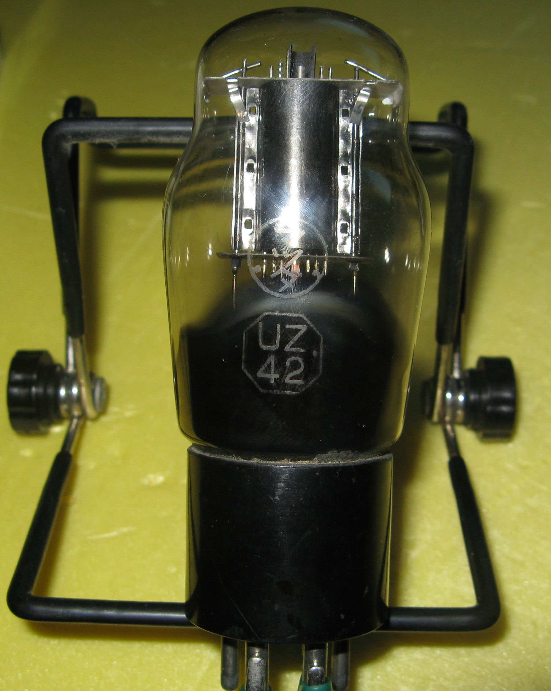 ラジオから真空管を取り出すのは簡単で昔の真空管式ラジオは裏蓋がネジ止めなどされておらず嵌め込みされているだけ。真空管はソケットから引き抜くだけ。その中でも子供ながらにカッコいいと思えたラジオの出力管UZ-42が今でも手元にあるのでヒータだけ接続して当時を懐かしんでみる。あったかい。オーディオ界隈では真空管が高騰しているとの事だがラジオ球であれば今でもヤフオク*1で安く手に入るんだなぁ。