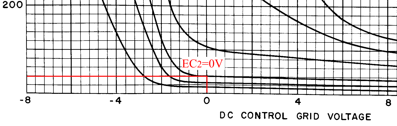 上の図はデータシートから一部を拡大した物。多分(俗にいう)ブレークダウン電圧を示していると思われる。グラフからプレート電圧が40V程度であればゼロバイアス制御が可能で、それ以上ではマイナスのバイアス電圧が必要と読み取れる。