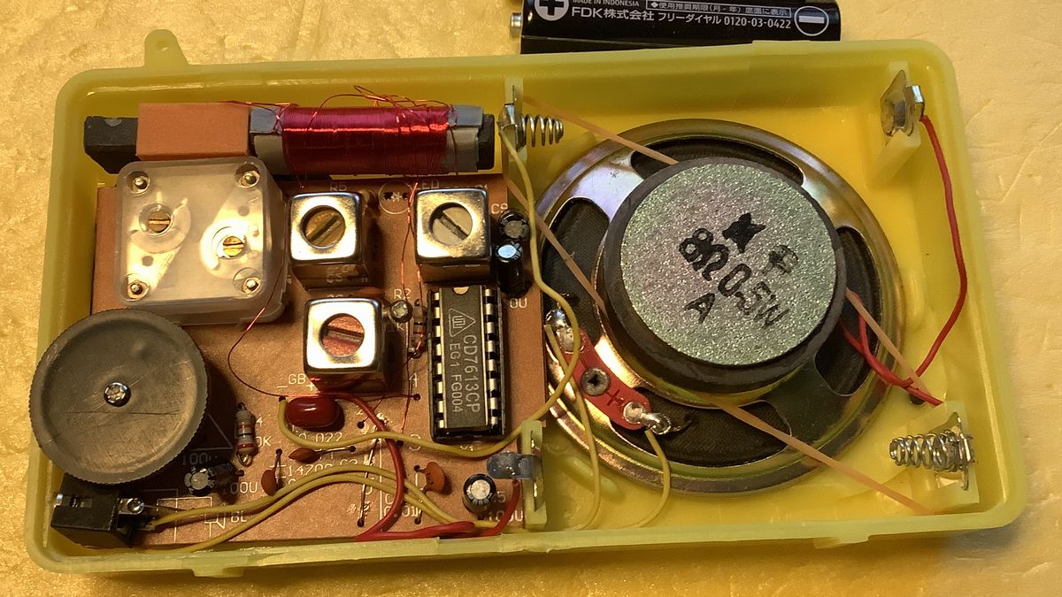 組立さえすれば無調整で取り合えず動く。音は悪くない。東芝のデータシートを見るとTA7613は3Vで使用可能だが音声最大出力は小さく70mW程度が限界か。
